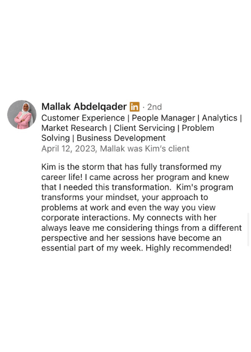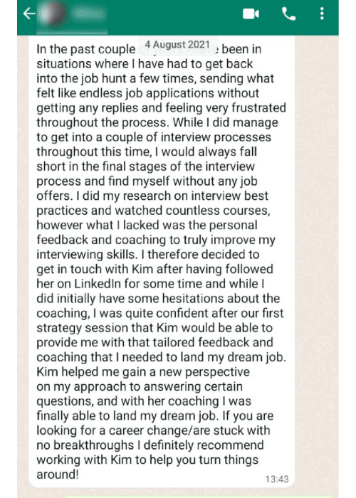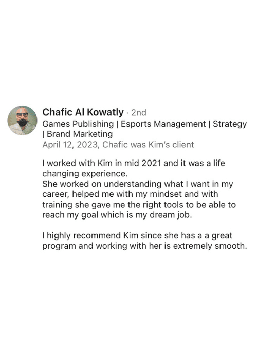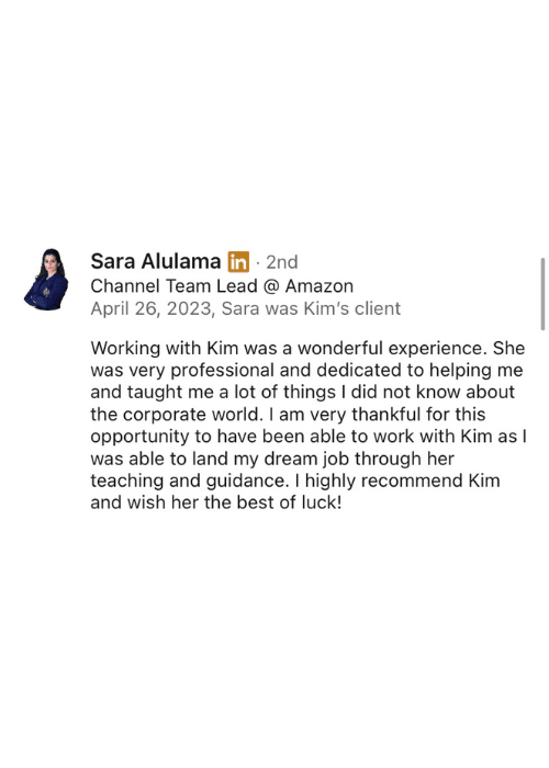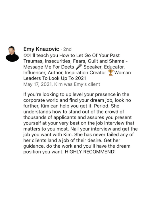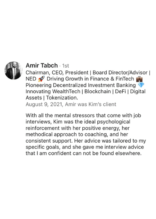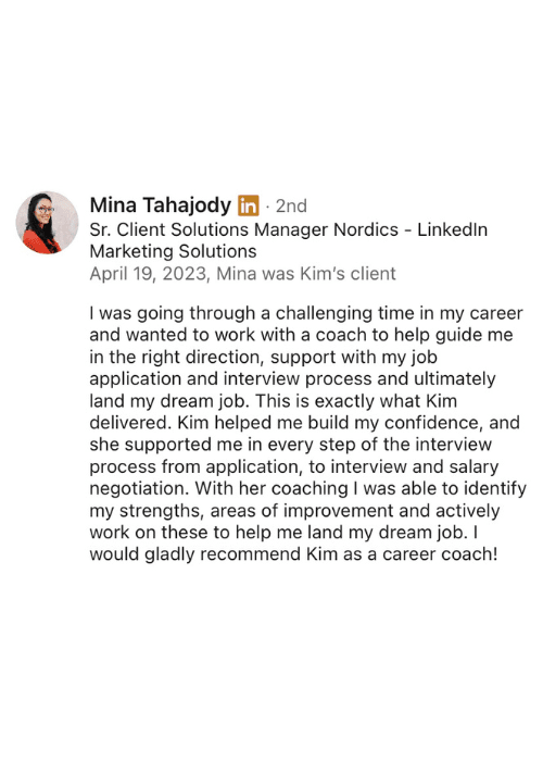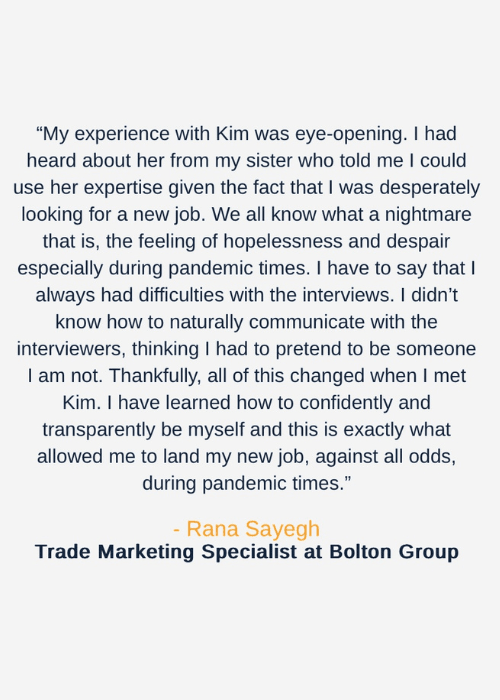 Now I spend my career being vulnerable so I can transmit passion and empower my clients by helping them find their spark and pursue their dream career. As an Interview and Career Coaching Expert, I’ve unlocked the key to success to guide you to get the job you really want.