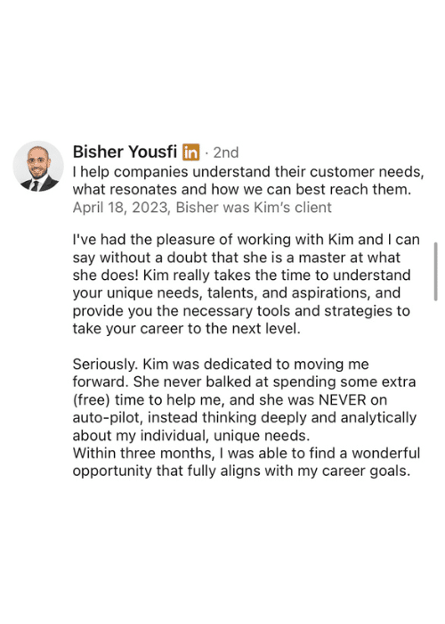 This has given me the opportunity to fine-tune my client’s ability to master job hunting skills and land jobs that they’re proud of.