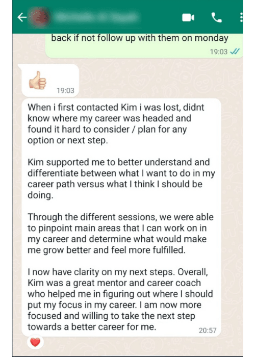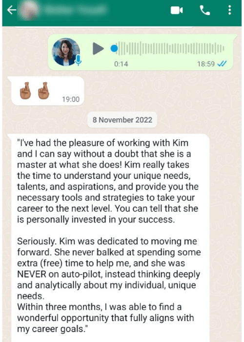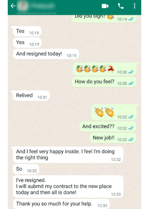You’ll begin to feel fulfilled, happy and in alignment with your true self. I’ll help you feel confident in your abilities and you’ll achieve whatever it is that you genuinely want - like landing your dream job.